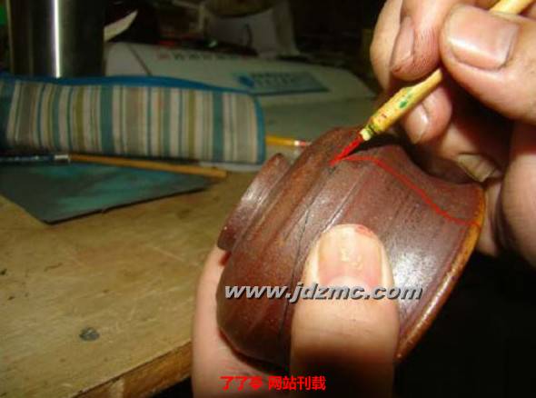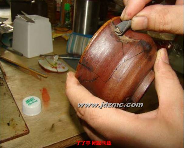 7、填补碎片之间的表面缝隙:小缝,用糯米与生漆的调和膏填补;大缝,可用木粉漆或漆线图填补