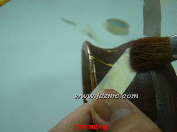 10、待漆半干后,将金箔裁剪成合适大小后,在上漆处贴上金箔