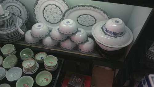 在国贸陶瓷广场一家商铺内,记者拿 着底款上标着“景德镇制”的一套瓷碗,问工作人员是否为景德镇生产,并对颜色有点发黄提出质疑,表示不像景德镇瓷。工作人员听到记者的质疑立刻解释道,“这个是骨质瓷,就是这种颜色,如果拿到亮一点的地方就会很白了。”并表示外地不做餐具,只做茶具。