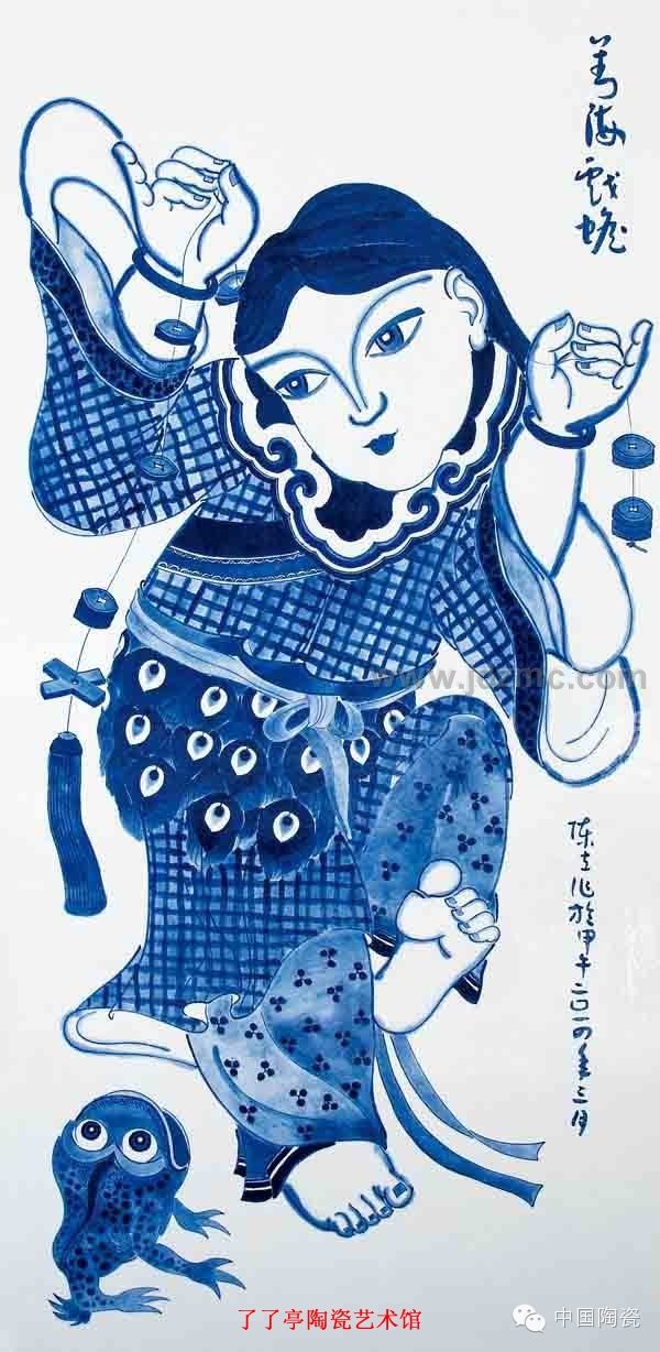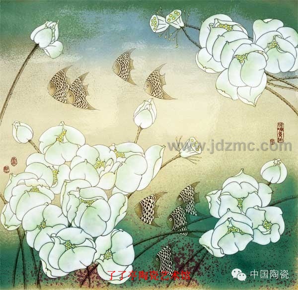 《荷塘鱼趣》 瓷板 郑欲晓作