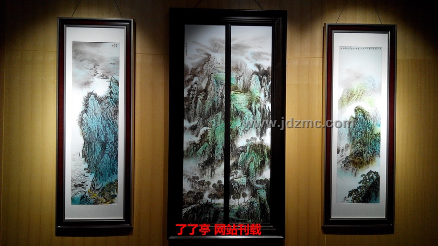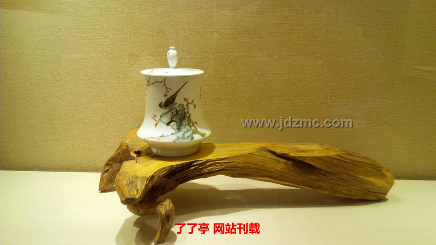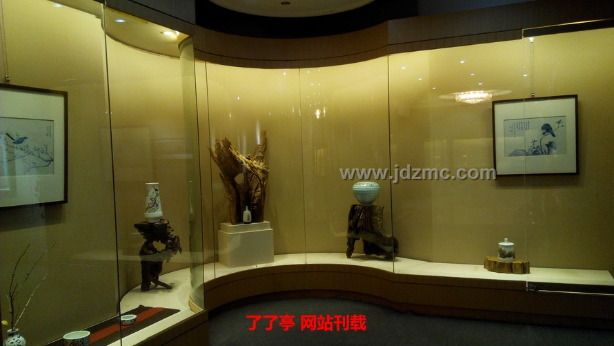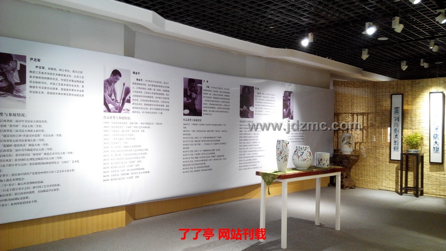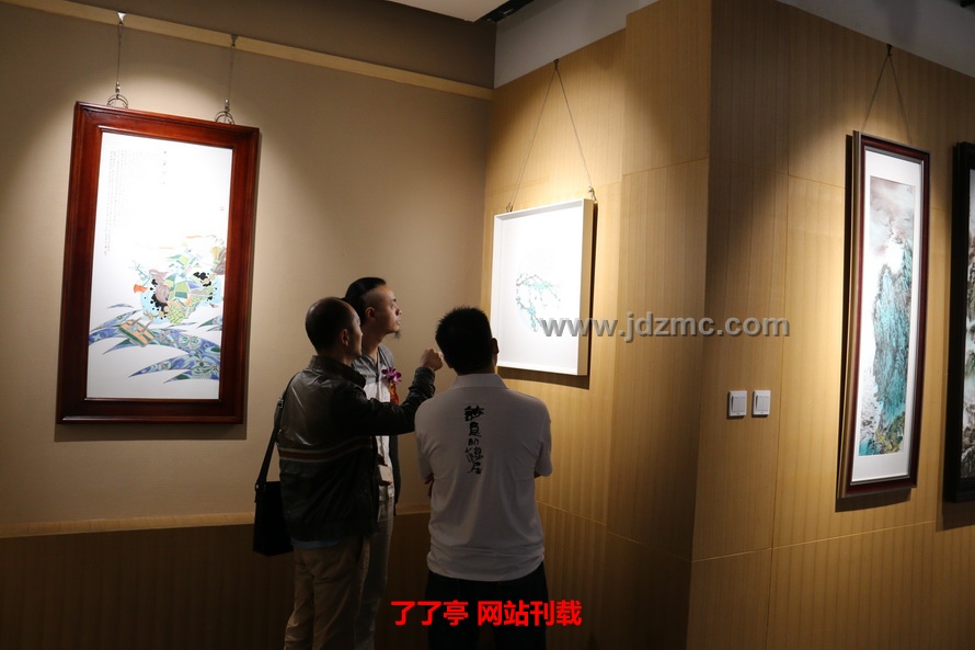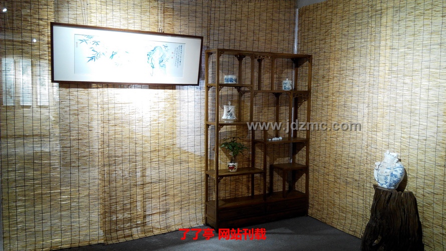 在华艺文化展厅,通过策展人的精心布置,展现出极具人文气息的生活空间。瓷器、古香古色的明清家具、芦苇帘营造了一种诗意的居住环境,契合了此次五人展的主题:“归来·诗意的栖居”。尹志军的“字非字”系列作品、揭金平的古彩人物、方毅的粉彩梅花、曾玉成的青绿山水、吴洋的青花花鸟风格各异,各具特色,在整个华艺文化空间里,构成了一个和谐统一的整体,富有一种禅味,使得参观者流连忘返。