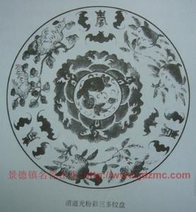 景德镇瓷器上的吉祥纹样,多由若干形象物来寓意。三、五、百、万的数字常见。比如: