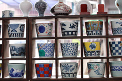 “益子烧”多出产碗碟、茶壶、茶杯等贴近生活的日常用品,厚实牢固,拿在手中沉甸甸的。寥寥数笔勾勒出山水图案的茶壶,可谓是益子烧的代表作之一。益子町的瓷窑和陶艺销售店有350家之多。