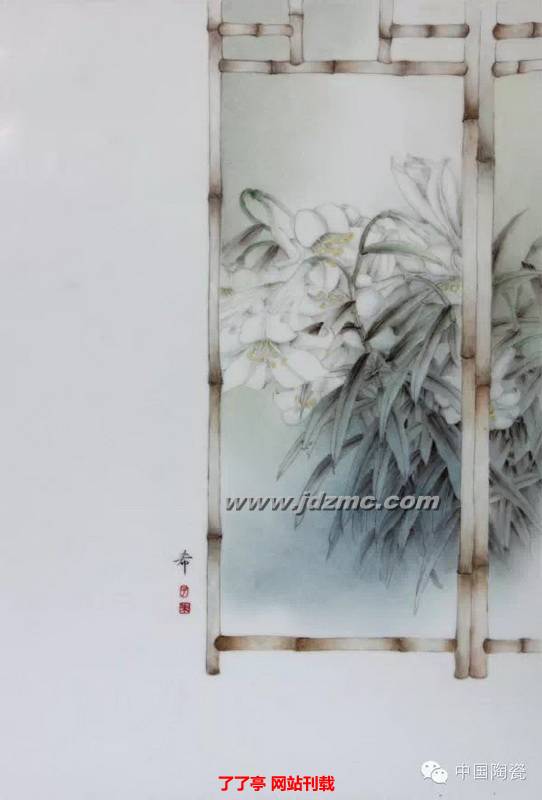 品读希睿的瓷画及对话,我渐渐感受到对这种“水静犹明”的向往正是她的心境,她所创作的画面也无不从中而来。如她的作品《凝望》系列,视线都是庭院中的窗格、门廊、屏风看向窗外的一片恬静风景,你虽看不到她,却可以感受她当下的状态。一如坐于案前,托腮凝望,伴着幽幽沉香,或遥想,或感怀;又如窗前扶琴,一曲《潇湘水云》在琴弦之间体会凭栏美景如画;再如院中石阶之上,泡一壶明前春茶,在水沸声中望向石门之外的竹林鸟鸣;更如那书房习字,抬头望向品屏风的一瞬间,仿佛置身于花海之间… …