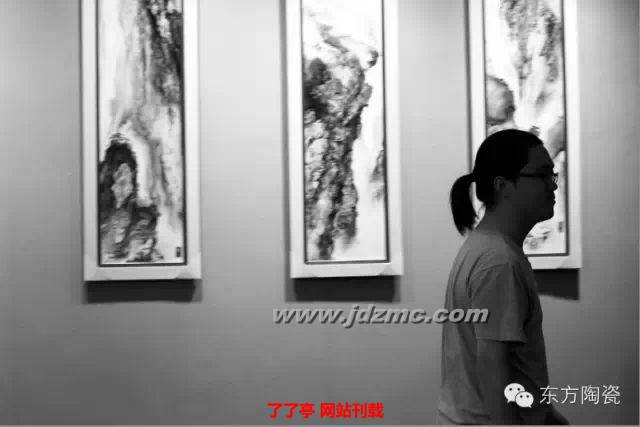 在泼彩的过程中,有刻意的引导色彩的深浅变化和流动纹理,有人为,有天成,每一秒的流变和停驻都藏着聚散玄机。就算烧成之后,作品悬挂在墙面,远观近玩,依然能感觉画面里的山体、石块、水流、树木和云气仿佛依然在运动在生成在生生不息的变化之中。