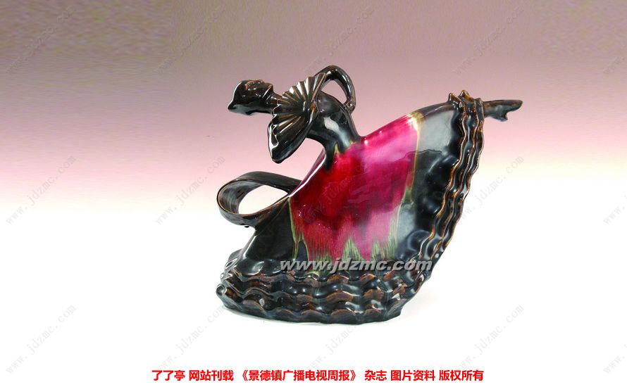 用流畅而简洁的线条表现西班牙舞的狂放风格,用郎窑红和乌金釉两种强烈对比的色彩来装饰,使其更增添了热情和火辣味。