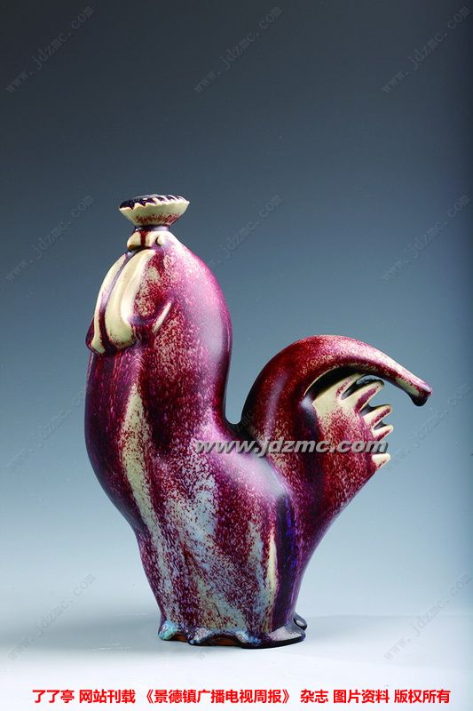 《双冠鸡》(钧窑) 尺寸:28cmx22cm 1988年作 Cock with Two Crests (Junyao kiln): in 1988, size: 28cm×22cm