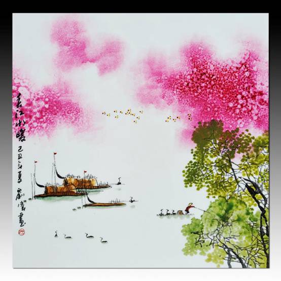 渔歌天际鸣归鸟 屋舍桃源涌霞图