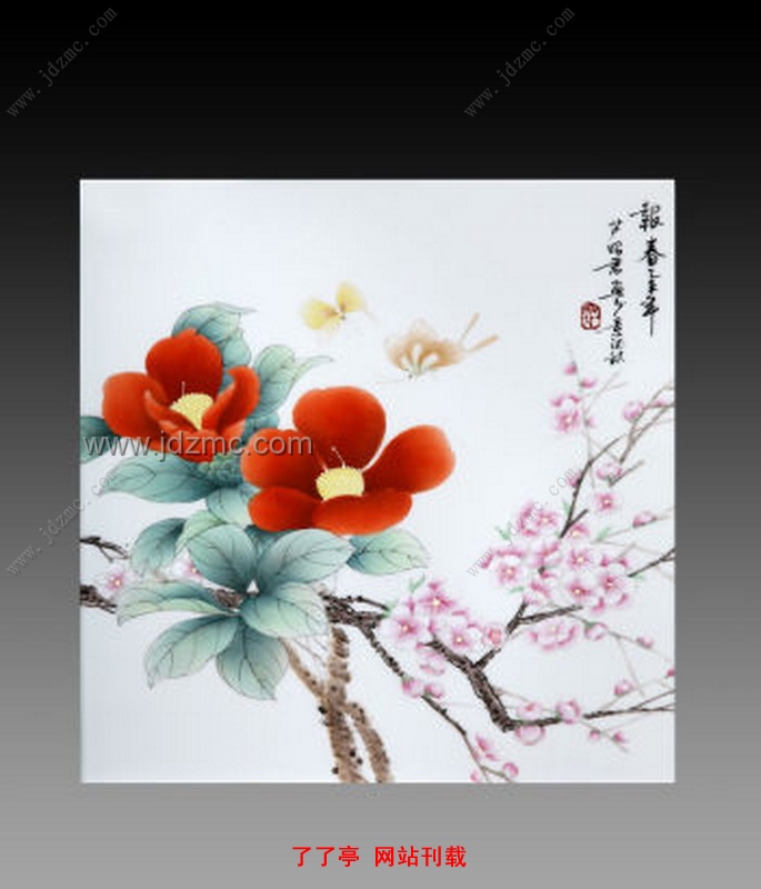 时值三月,春花正开的灿烂。灿烂的阳光下,春风温柔的吹拂着,朵朵桃花迫不及待的从树枝里冒出头来,好奇的打量着这个世界。花朵的苏醒,即昭示着春的到来。昭君的《报春》一作,正描述了这样一幅春花烂漫的画面,傲然挺立的红色花朵和几枝横斜着的浅粉桃花,一高一低,错落有致。暖和的天气里,花朵散发出的浓郁香气让人沉醉,连着招惹的小蝴蝶也来了。如此一来,观者虽只见花色,却犹如闻花香,观感立即变得清晰生动起来。小蝴蝶儿,小雀鸟儿都成为了昭君用来表现画面生动的点睛之笔,在作品《春韵》中,观者可以想象若是画面上少了那一只独自栖息在桃枝上的小雀儿,此作一定是变得呆板无趣了。又如新粉彩瓷板《花开富贵》中,雍容华贵的牡丹花与小巧灵动的雀鸟儿,无论是少了哪一部分,作品水准都将大打折扣。