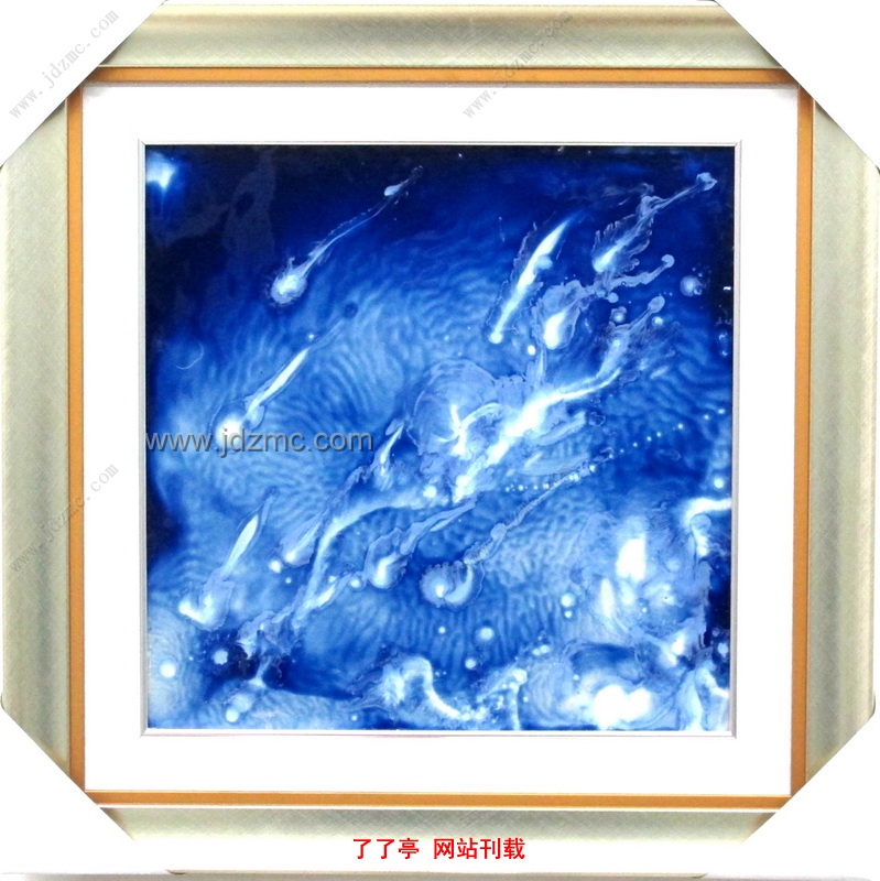 底釉:海洋蓝色釉,釉面肥润,平滑纯净,犹如蓝宝石般的亮丽。面釉:乳白高光色釉,经高温窑变为三种物象,液体,软体生物,气泡。