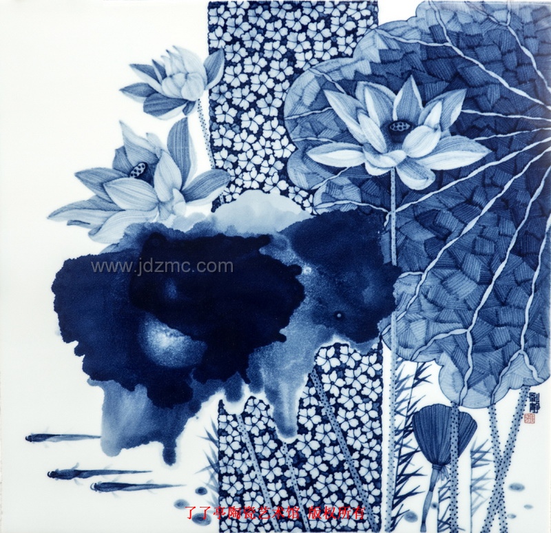 时代在不断前进,刘静的青花陶瓷装饰艺术也在与时俱进,绣球花不仅作为装饰题材的主体,也可以作为其他主体的陪衬物。她所追求的是题材形式上的变化和视觉上的感受,从其“荷花系列作品”中不难看出,刘静在实践中不停探索,蓝色绣球花也在不断更新变化着。一朵朵荷花,紧紧依偎着碧绿的荷叶,亭亭玉立,风姿绰约。有的荷花花瓣全展开了,有的含苞欲放,显得更加清秀、雅洁。这样的含笑伫立,娇羞欲语的千姿百态,预示着一片生机。而绣球花成为了背景,以衬布的形式整齐摆放,点、线、面的构图设计,将单体花瓣形象重复组织起来,连续排列使画面更加丰富饱满。同时,加入泼墨的晕染,一动、一静、一虚、一实,绣球花的装饰设计与泼墨的自然流动相辅相成,与不规则的荷花情境相呼应,传递了一团和气。