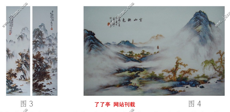 中国山水画的透视是北宋绘画理论家郭熙提出的“三远法” 即平远、高远、深远法。国画功底深厚的汪野亭很自然的将这一透视方法运用到他的瓷画创作中。在构图中把山上山下、山前山后、这山那山的景物安排在同一个画面上,使画面具有更丰富的表现力。