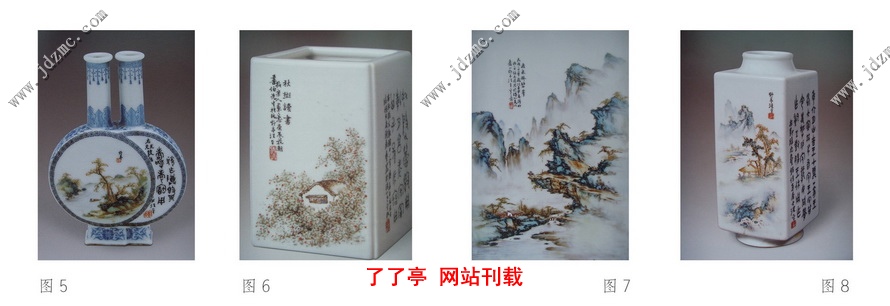 汪野亭的构图虽以全景式构图为主,但在尺寸较小的瓷器,如茶具,文具,瓷壶等上画的山水构图简洁明快,以特写镜头为主。例如图5和图6,构图简洁,选取局部特写画面,使绘画的主题更突出,富于诗意,反映出“边角之景”构图方法的影响。在不同造型的瓷器上,采用与之相应的构图方法,既符合美的规律,又符合人们的欣赏习惯。