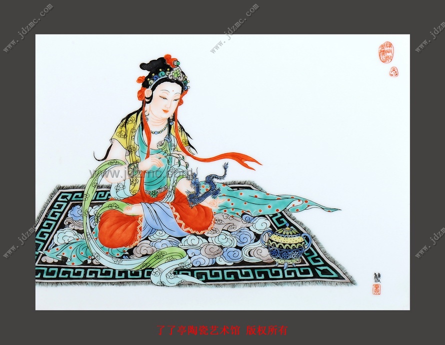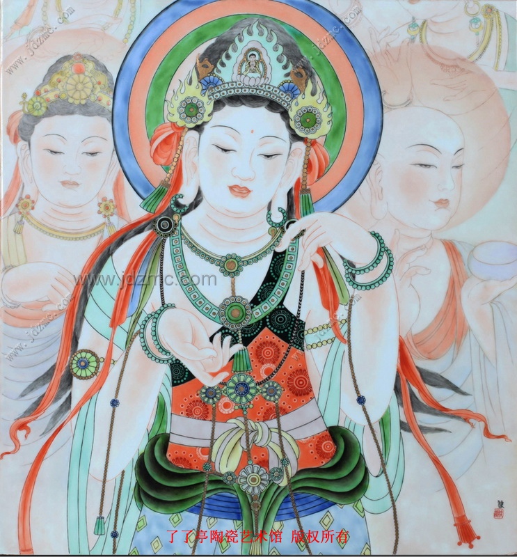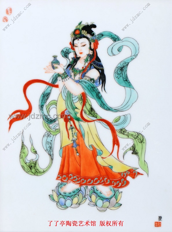 此作品是以敦煌莫高窟第57窟中被人称为“最美的观音”的造像为原型进行创作的,运用陶瓷古彩技法的表现形式,突出展现古彩的艳丽和沉稳,充分展现出观世音菩萨优美的体态和汉唐风韵。 |