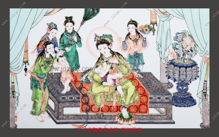 作品采用满构图,色彩鲜亮,几个仕女簇拥着画面的中心,她为释迦摩尼的姨母,正逗弄着襁褓期的悉达多王子(释迦牟尼出家前为王子),温暖的亲情流露而出。 |