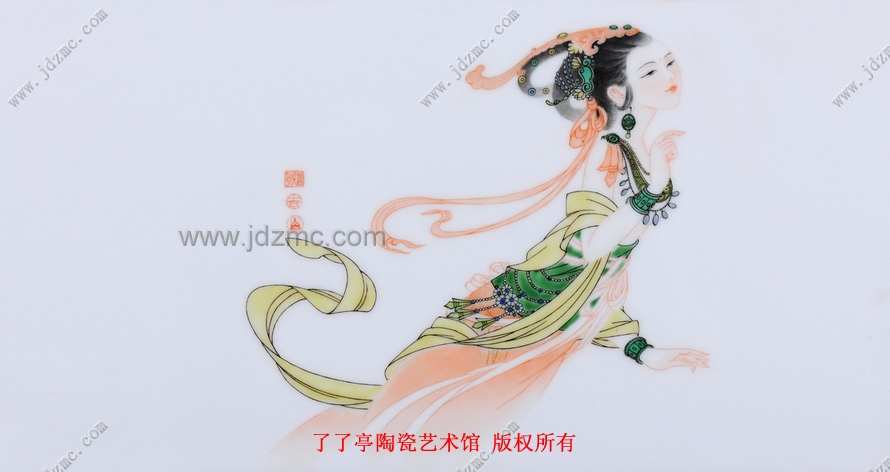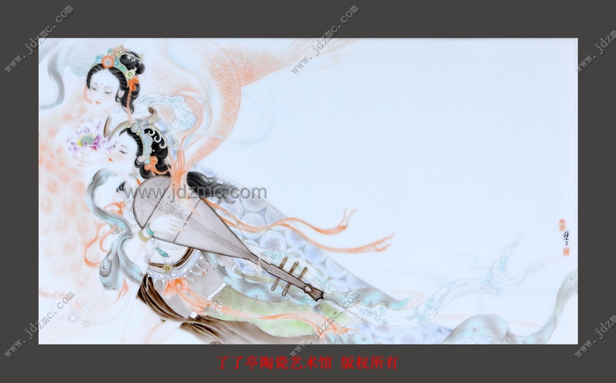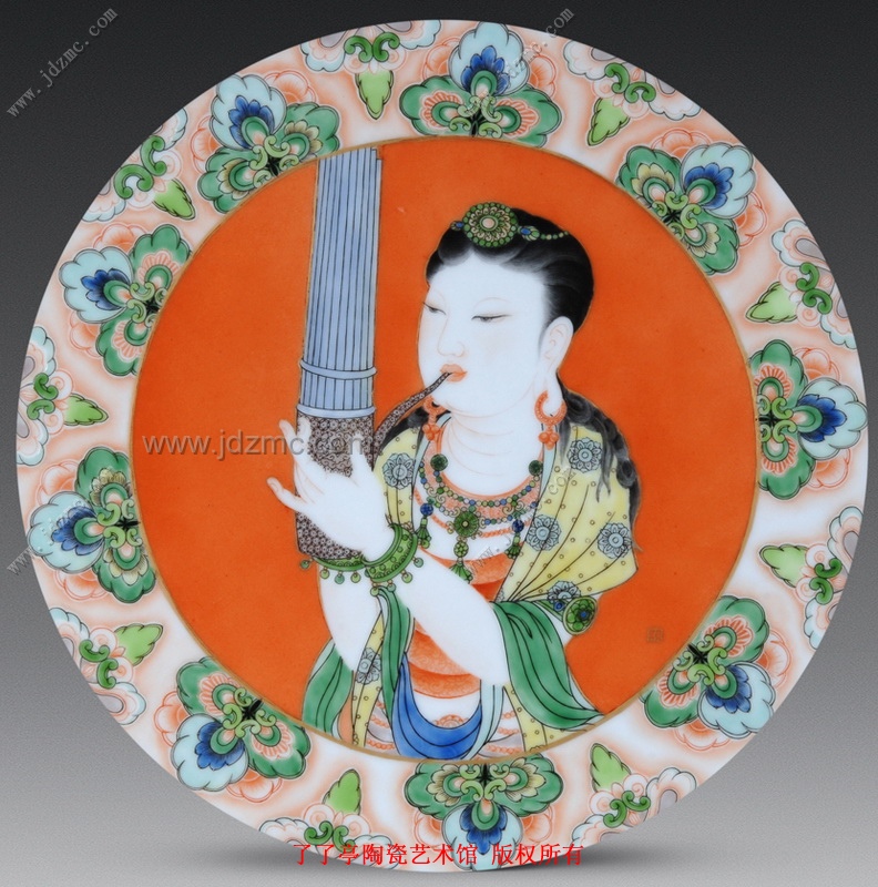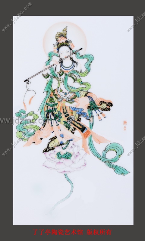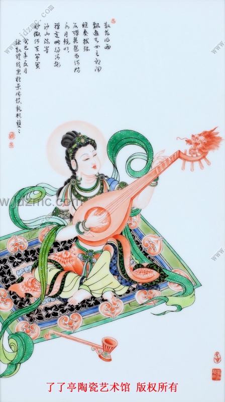 作品以红色釉作背景,充分发挥古彩颜色特点,色彩对比极其强烈,伎乐天体态婀娜,手持乐器轻轻吹奏,余音缭绕,悠扬婉转。 |