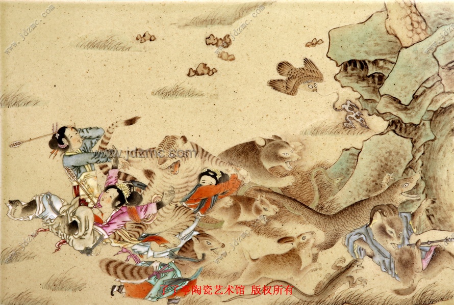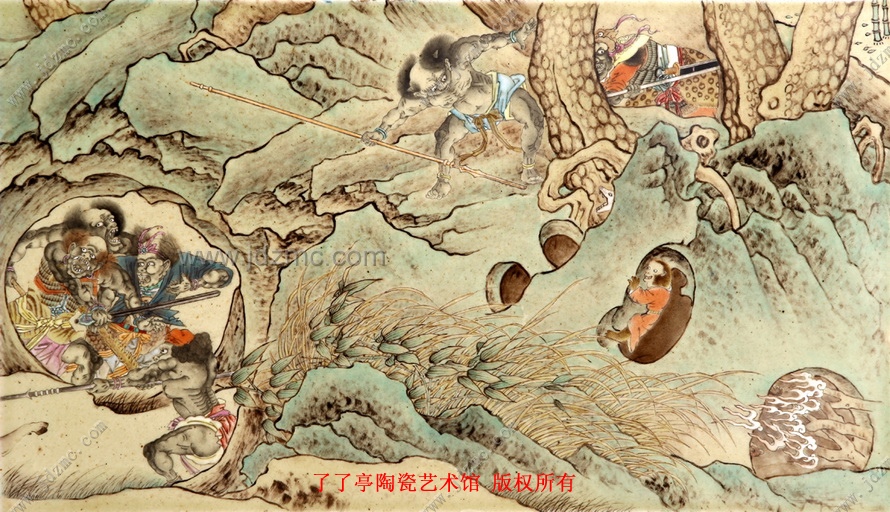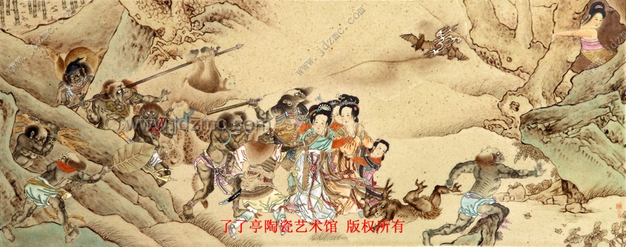 内容为民间传说,二郎神搜山降魔的故事。描绘神兵神将们耀武扬威地搜索山林中各种魔怪。魔怪们均是各种野兽变的,有虎、熊、豕、猴、狐狸、山羊、獐、兔、蜥蜴、蛇及树精木魅等。这些妖怪,或是原形,或化为女子,他们都在神兵神将们追逐下,仓惶逃命,或藏匿山洞,或拒绝受擒。而那些神将们则手持刀枪剑戟、纵鹰放犬,前堵后截,使妖怪无处逃身。此作品内涵深远,人物神情刻画深入传神,构图疏密得当,对故事情节的展现恰到好处。 |