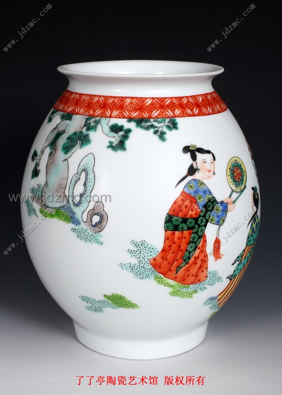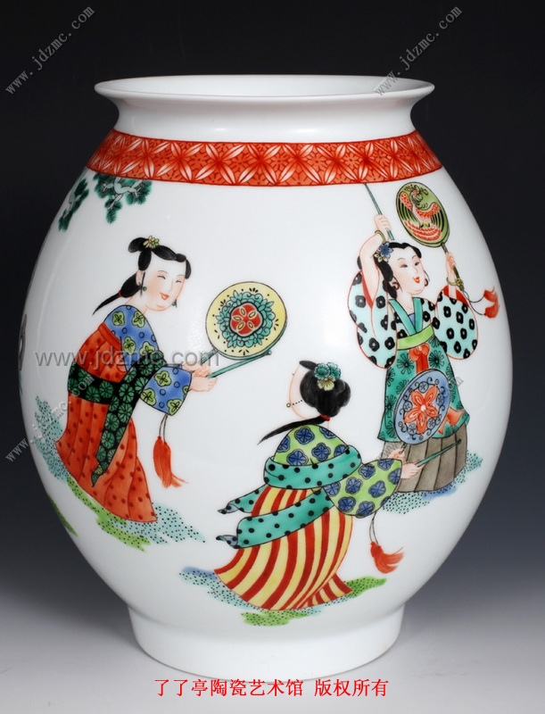 瓷瓶造型优美,上部为古典的装饰图案,画面中心是设计夸张的仕女在嬉戏打闹,几人之间互动有序,前后呼应。作品整体色彩对比强烈,赏心悦目。 |