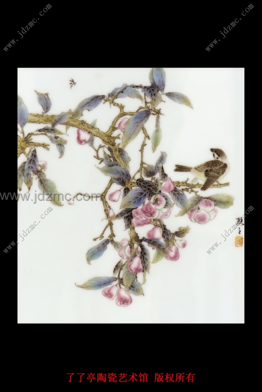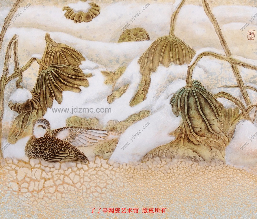 此作品描绘冬天里荷花残叶被雪覆盖的场景,以颜色釉的纹理作为装饰,残荷负积雪,禽鸟游憩其间。画面既有残荷的寂静之美,又有禽鸟的生动之美,一股清雅之气扑面而来。 |