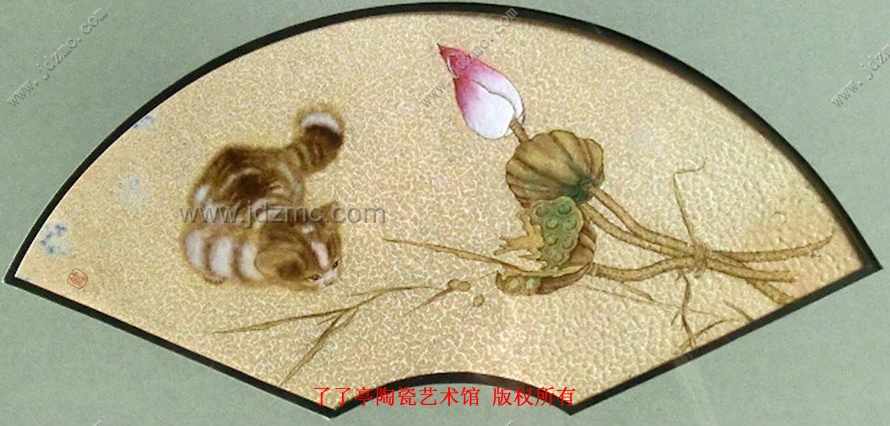 作品以颜色釉为底,运用粉彩技法进行创作,把小猫戏莲蓬的一瞬间捕捉定格下来。用以静写动的手法,将小猫作势欲扑的专注,生动的表现出来了! |