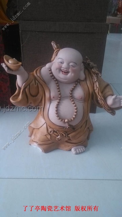 (帮朋友写了一段雕塑罗汉的宣传文案,觉得写得还行,发上来给大家用用)雕塑罗汉作品一路发,人物开相奇古,身着古棕僧袍,僧衣线条飘逸,衣纹皱褶流畅准确,真实感强。罗汉左手持寿杖,右手拖元宝,面相安静祥和,好似立于云气之上,气氛幻化,神秘莫测。这种特属于景德镇雕塑陶瓷装饰元素,以传统文化为创意背景,将陶瓷工艺材质的表现手法推到了一个巅峰的层级,把“一路发”罗汉的形貌神情表现得细腻精妙。