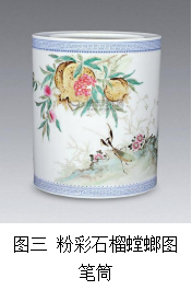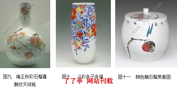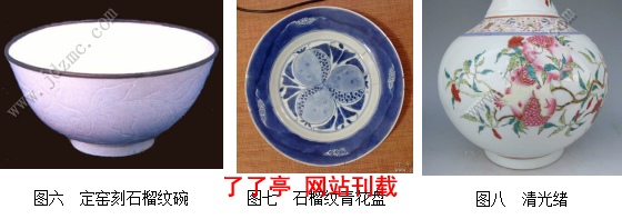 如石榴纹,图六至十一所示,从装饰手法上有釉下刻花、釉下青花绘画、釉上粉彩装饰、颜色釉装饰,丰富多样的装饰手法使得画面颜色从单一变得丰富多彩,而釉上装饰更加接近现实,具有更直观的表现效果;绘画手法分为工笔和写意两大类,其多在白色釉底上做效果,略显单调,工笔绘画手法给人工整细腻之感,写意手法则具有清爽豪放之情,在色调上较工笔也更加浓烈;在构图上,采用通景式、折枝式以及分割式构图,折枝或局部留白这种装饰方式更能体现蔬果草虫的灵性;器形多采用传统的器型如碗、天球瓶、盖罐等,缺乏创意,不能与蔬果草虫这种题材很好的结合;整体效果表现上,刻花和青花装饰等颜色单一,而粉彩给人以丰富而直观的视觉效果,淡雅清新,也更加容易表现静谧的感觉。