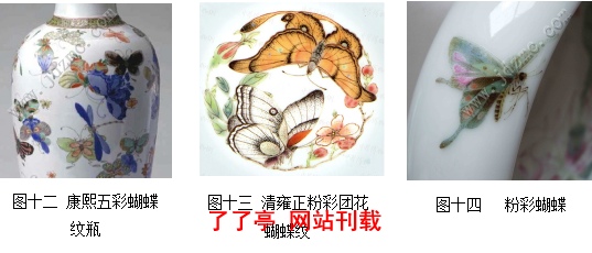 又如草虫纹——蝴蝶纹,图十二至十四所示,其装饰手法上为釉上彩绘,绘画形式从图案式向写实式发展,构图上有散点式、开光式、点缀式,各具特色,装饰效果比较清新雅致,精致工细,图十二和图十三更具有装饰的意味,图十四的粉彩蝴蝶更注重层次变化和配色的运用,效果更加清新雅致、活泼灵动,增强了事物的表现力。
