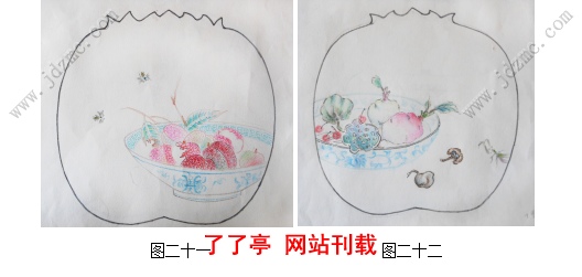 画面内容上如图二十一和图二十二所示,这两幅作品在选材、处理方法、构图上做了相似处理,都是在青花碗(盘)中盛满了果实,外面几只姿态各异的昆虫装点画面,一静一动,使画面丰富而灵动。