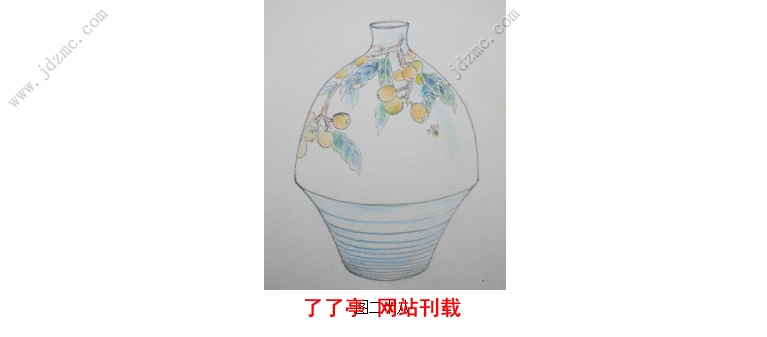 该作品器型设计饱满而有流线感,通体青釉与刻花相结合,画面设计采用枇杷题材,枝叶穿插,虚实多变,累累的枇杷果实极具有春天的感觉,粉彩的绘画技法使得画面雅致粉润,耐人寻味,足部的线纹刻划犹如清水滋润着果实,一群蜜蜂围绕着嫩黄的果实偏偏起舞,具有强烈的田园气息(如图二十八)。