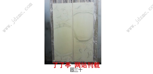 首先是在草图的基础上,用手工成型的方式,尽可能的完整表现草图中自己的设计思路,制作泥板和瓶型,等泥坯干透或快干时对其进行刻花装饰,如局部半刀泥式花纹刻花,注意刻刀的走向、力度,力求线条了流畅有力、均匀有致。其次待泥胎刻花部分完成后就是上釉程序,根据自己预期的效果选择不同的釉料进行喷釉,然后入窑高温烧制,如图三十。