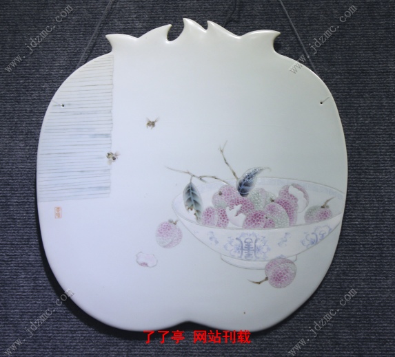 该创作外形采用仿生的手法,雕刻成简化的石榴形状,在头部做了不同形状的处理,造型的设计亮点在于穿孔悬挂的方式,不同于以往的裱框镶嵌的形式,外形由内部向边缘逐渐圆滑过渡,整体体量变得轻巧同时可以减轻墙壁的承重。釉色选用无光白、无光淡蓝、无光淡黄、无光淡绿,给人一种清新宁静的感觉,通过粉彩的釉上装饰形成有光与无光的对比。