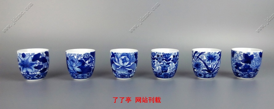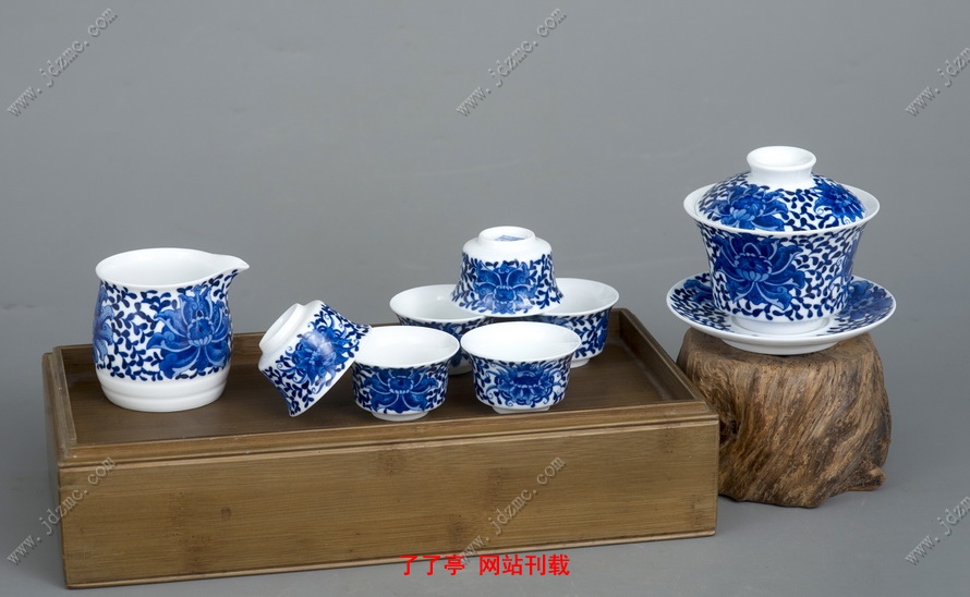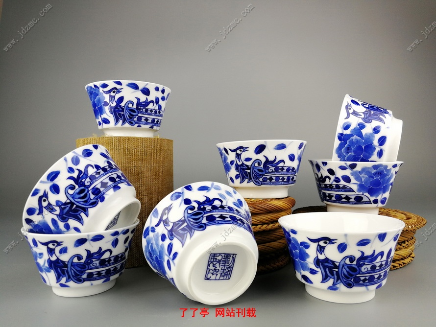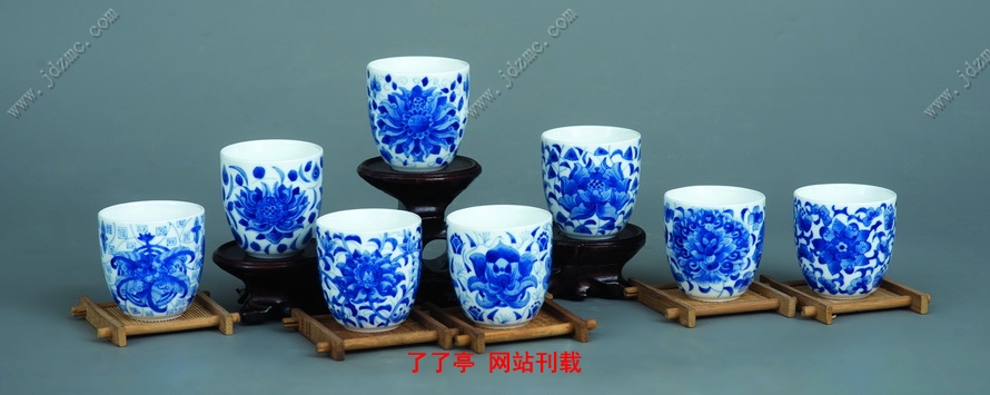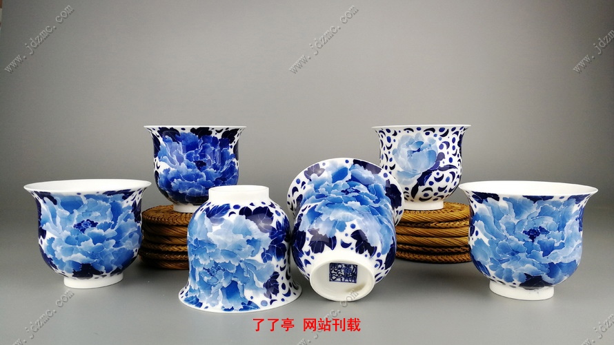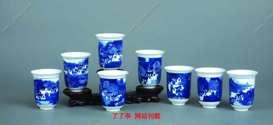 我的一系列青花瓷作品中大多数运用了青花勾线汾水的装饰技法,有青花瓷板,有青花瓷茶具和单杯等,在圆器坯体上绘制青花纹样,一般是悬腕画坯,因此要求胆大心细、意在笔先,这样画出来的纹样体现出速度的节奏感,线条也就流利奔放、气韵生动,在平面的瓷板坯体上作画跟画国画是一样的平铺着画。所以,青花瓷的造型和装饰是对立统一相辅相成紧密结合的整体。青花不是为了装饰而装饰,它总是紧紧地围绕一定造型的适用要求和内容,以此决定装饰题材的选取和装饰的艺术处理,根据造型的不同特点,做到“量体裁衣”,易使装饰紧密地符合造型的转折变化“因地制宜”地切合不同部位的尺寸比例关系,因而使装饰紧密地结合造型的形体是很重要的,老艺人所说的“要顺着器型走”就是这个意思。我喜欢青花瓷“水乳交融”和“相互辉映”。