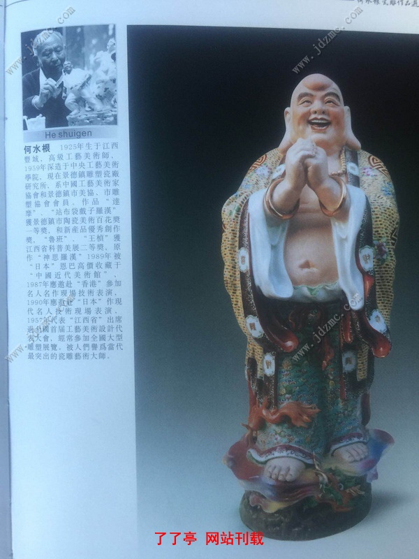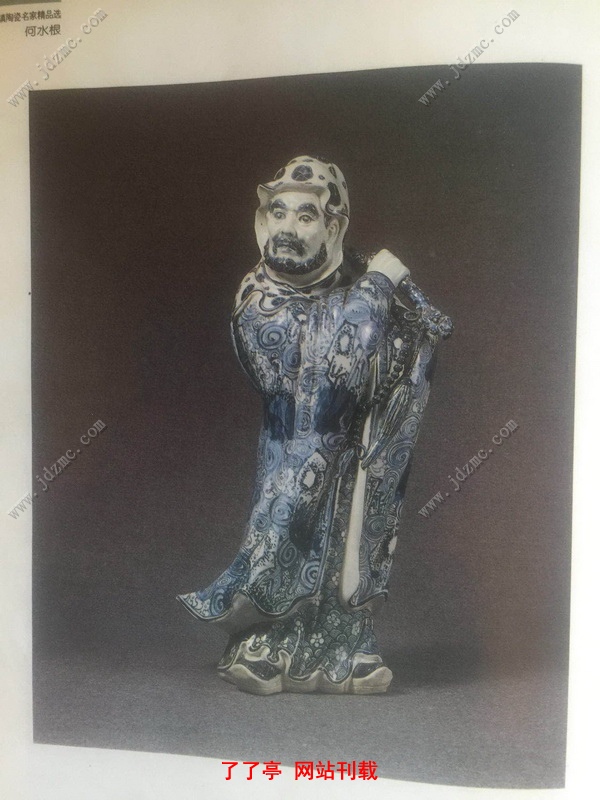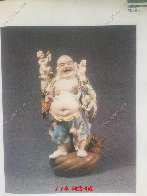 何水根11岁随母亲来景德镇学艺,早年师承多位雕塑名家,与曾山东同门师兄弟一起学艺,得其真传。继承了其师卓绝瓷雕创作技艺,经验丰富,工艺精湛,风格独特。既擅长圆雕人物造型设计,又精于镂刻亭台楼阁工艺,尤以塑造“罗汉”和历史人物见长,作品造型怪拙古僻,讲究神韵风采,刚劲传神,创造出上千个优秀作品。他的力作《背斗达摩》、《济公》尽舍一切繁枝缛节,致力轩昂的神仙气度,人物形象写实传神,刻画生动。