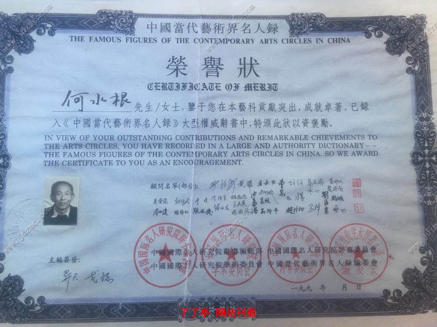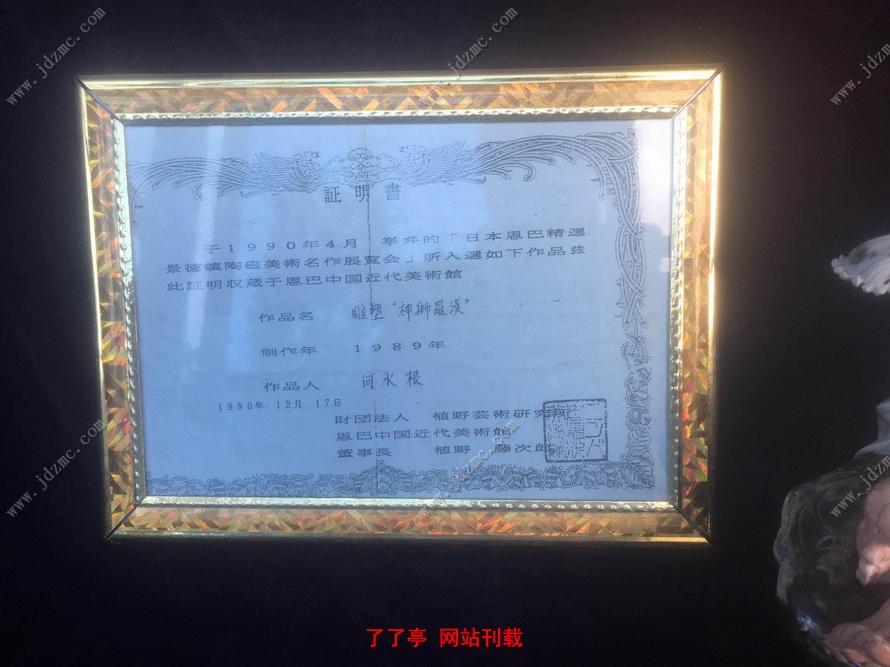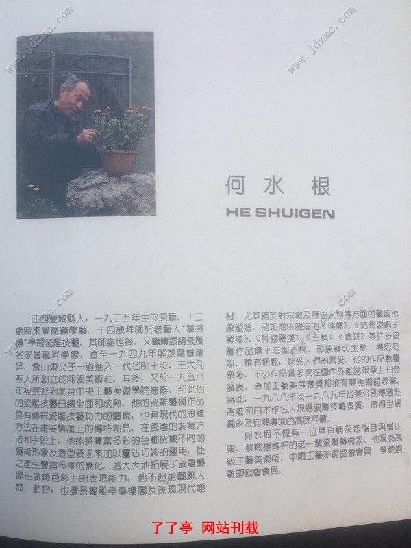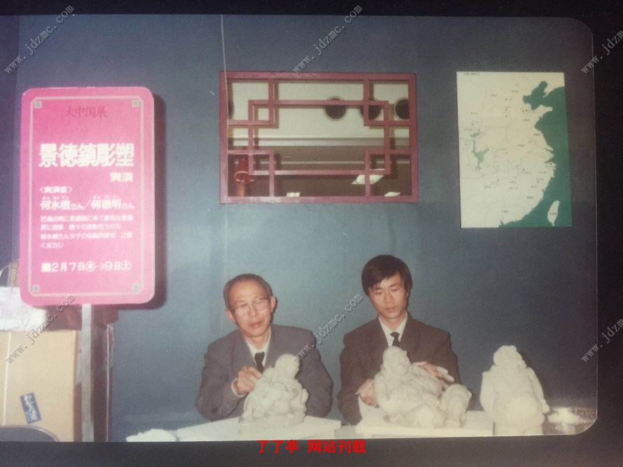 1987、1991年应邀赴香港、日本、澳门、新加坡、泰国参加陶瓷名作展及现场技艺表演,传略载入1990年《中国当代美术家名人录》、1994年《中国景德镇陶瓷名家精品选》、2003年《景德镇陶瓷艺术家辞典》、1995年《20世纪国际美术精作博览》、1989年《中国现代艺术家名人大辞典》、1994年《世界书画篆刻家通联大全》、1994年《国际现代书画、篆刻家大辞典》、1993年《景德镇陶瓷美术百家》。何水根作为景德镇市雕塑瓷厂的创始人之一,与瓷雕名家曾山东、蔡敬标被外界尊称为“雕塑瓷厂三老”(瓷雕艺术泰斗),何水根被誉为当代最突出的瓷雕艺术大师,后两位名家数年前已经辞世,何水根作为“三老”中唯一在世的老艺术家。近日,记者带着敬仰的心情走近了这份老艺术家,虽然何老年岁已高,但从他有点模糊的记忆中,记者感受到了何老对那个年代的怀念。