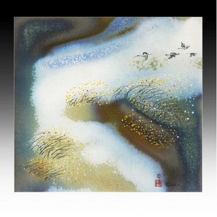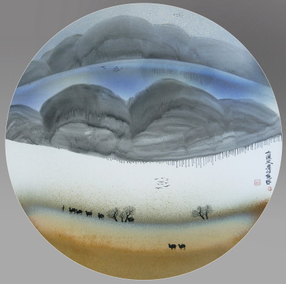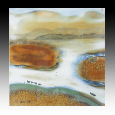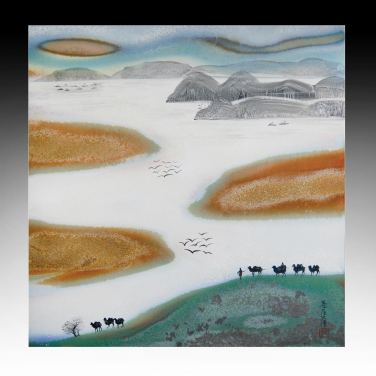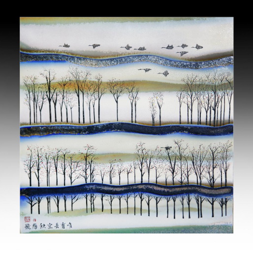 釉彩风景系列是饶舜近几年创作的瓷板画系列作品,他充分运用高温色釉窑变所产生的奇妙无穷、变幻莫测的意境。《大漠》系列作品用色釉表现景致的厚重感,釉上泼彩表现山水的层次感,巧妙的运用这两种材质上的对比与交错,打破了传统的陶瓷语言形式;《秋雁》系列将作品不拘泥于风景客观自然的真实再现,又不执着于脱离自然景致的抽象表现,以意摄象、立象尽意,妙不可言。有时山清水秀,有时气势若虹,有时荒漠孤凉,有时细雨绵绵。相对于传统瓷绘,这些清新简约的风景图式或不同组合的创作语言,是饶舜心中艺术世界的表征,他的思想情感、审美意识、艺术手法做到了真正意义的融合,更具有深层次的思想内涵和寓意,使作品充满了生命力。