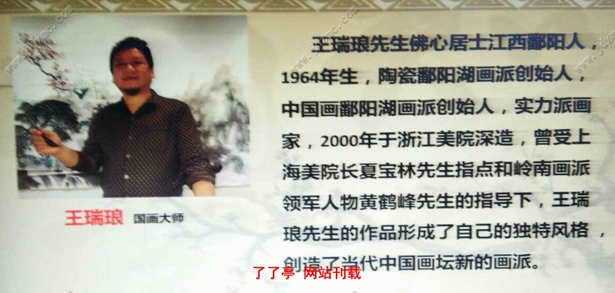 王瑞琅先生(王高平),佛心居士,江西省鄱阳人,1964年生。陶瓷鄱阳湖画派创始人,中国画鄱阳湖画派创始人,实力派画家,2000年于浙江美院深造,曾受上海美院长夏宝林先生指点和岭南画派领军人物黄鹤峰先生的指导下,王瑞琅先生的作品形成了自己的独特风格,创造了当代中国花坛的画派。