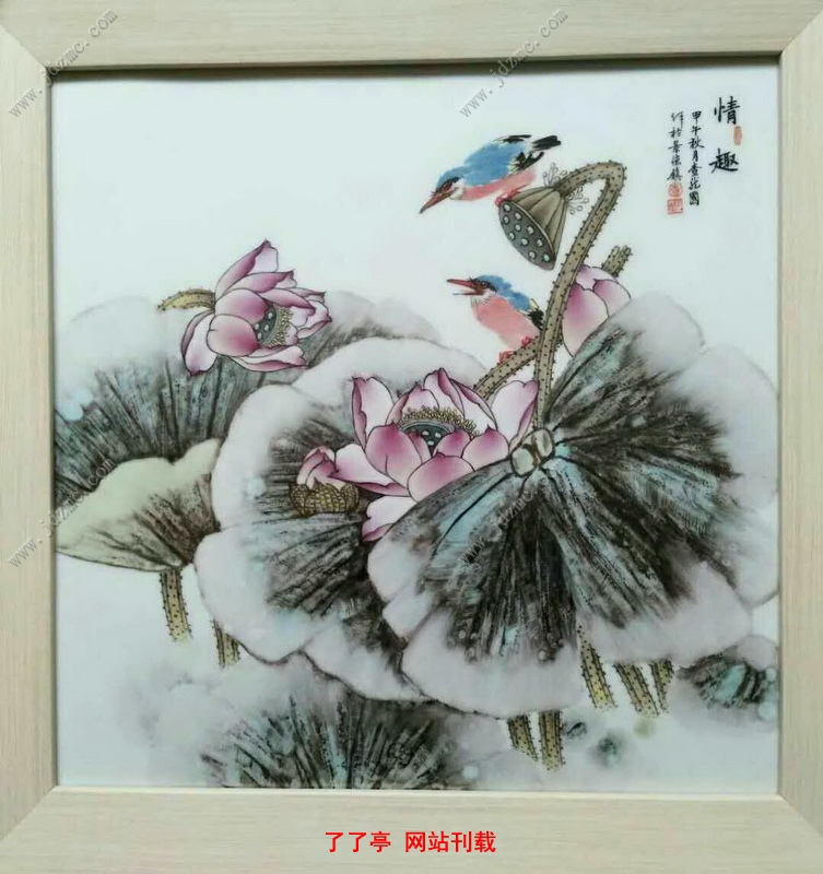 出生于1977年的查龙国,十八岁来到景德镇时就被瓷都景德镇浓厚的陶瓷艺术氛围所浸染,开始涉足陶瓷绘画。2000年在景德镇书画院大专班陶瓷绘画专业学习,先后拜中国一级美术师夏日明、中国陶瓷艺术大师熊汉中为师,系统的学习和名师的辅导使他打下了扎实的绘画基础,尤其在浅粉彩装饰上最见艺术水准。查龙国的粉彩艺术作品,其釉上粉彩的技艺不仅深厚于人物画,而且还在浅粉彩花鸟画方面的创作上独辟蹊径,独具特色。众所周知,陶瓷花鸟画在当代陶瓷艺术中占有十分重要的位置,因为无论是发展空间上,还是在创作难度上,花鸟画永远是不朽的创作题材,也是景德镇陶瓷绘画的三大画种之一。我们可以从三个方面来品读查龙国的陶瓷花鸟作品,第一他的花鸟作品多取材于乡村小景、花鸟草虫,以工兼写的手法把每件作品刻画的栩栩如生,极富生活情趣,再用现代人的目光去审视作品所表现的情感内涵,是查龙国先生创作粉彩花鸟画的一大亮点。第二细品查龙国的陶瓷花鸟画作品可以体会出那种空灵、清雅,小中见大,韵味悠长的感觉。一二只小鸟,几块石头,点缀几株花草,简练的几笔使画作简淡天真,典雅出尘,于平淡中生清雅,生拙之外谋新奇,生出种种清雅动人的艺术形象。如作品“情趣”表现的是盛夏的荷塘,整件作品大面积的荷叶点缀一朵荷花,二只翠鸟立在莲蓬上,画面构思巧妙,水墨点染,形象生动,富于情趣和诗意,用笔墨传达出作者最深切真实的感受。自然界中的花草鸟虫是再普通不过了,而查龙国先生却能以细腻的笔触、准确的形象刻画与诗意的表达相结合,创作出一种简淡、意趣之美,给人一种优雅、和谐、含蓄的诗情画意之美感。第三赋彩也是陶瓷花鸟画创作的必要过程,在赋彩方面查龙国先生的作品讲究色彩的绚丽,但色彩是杂而不混,这是他能巧妙运用色彩的冷暖对比与整幅作品情绪调子的统一,注意体现事物本身所固有色彩的结果。查先生认为,我们生活在当下快节奏的时代,笔墨、色彩的运用应该强烈些,才能符合当下人们的审美需求。他用纤细流畅的笔线和重墨浓彩的强烈对比突出他所表现的景物,予人以鲜明的视觉效果。他的大多作品以鲜艳的色彩为主,辅以浅淡的墨色,色彩占主要位置,墨色相衬,色彩相和,画面显得生动活泼、富有生气和装饰感。能使我们想起哪悠然的乡村田园时光,而忘却了都市的喧嚣。