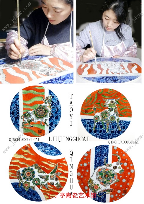 第一,工艺简述:青花斗古彩是以釉下青花汾水图案装饰与秞上多种色彩相结合的瓷器装饰艺术。它先在坯体上画好青花部分,然后罩上青白釉等透明釉,入窑经高温1300°烧制而成,烧好后在空白部分用秞上彩色颜料进行彩绘、平涂填色,再入烤花炉中经800°烘烤,两者结合绘制和烧制而成,称为“青花斗古彩”。青花清新雅致的色调与釉色浑然一体,同中国画中的墨分五色一样,青花汾水料体现出了头浓、正浓、二浓、正淡、影淡五色,层次丰富,沉着典雅。传统的古彩美在大红大绿,现代的古彩多种形式并存,红、黄、蓝、绿、紫的总体色彩华丽富贵,多用点、线、面来表现,青花和古彩两者结合意趣横生,装饰感强。