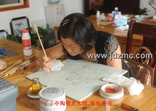 上午8时,16名陶瓷手工彩绘参评者陆续抵达装有两个监控探头的考场,着手在瓷板上或瓷瓶、瓷盘上再现参评作品的面貌。不同的是,他们有的带了样图,有的脱稿绘画,相同的是,他们都关注于眼中的瓷、手中的笔,现场气氛显得有点紧张。随着时间的推移,参评者渐入状态,气氛多了些活跃度,部分参评者还会相互交流观点,自信的早早画完就离开考场。