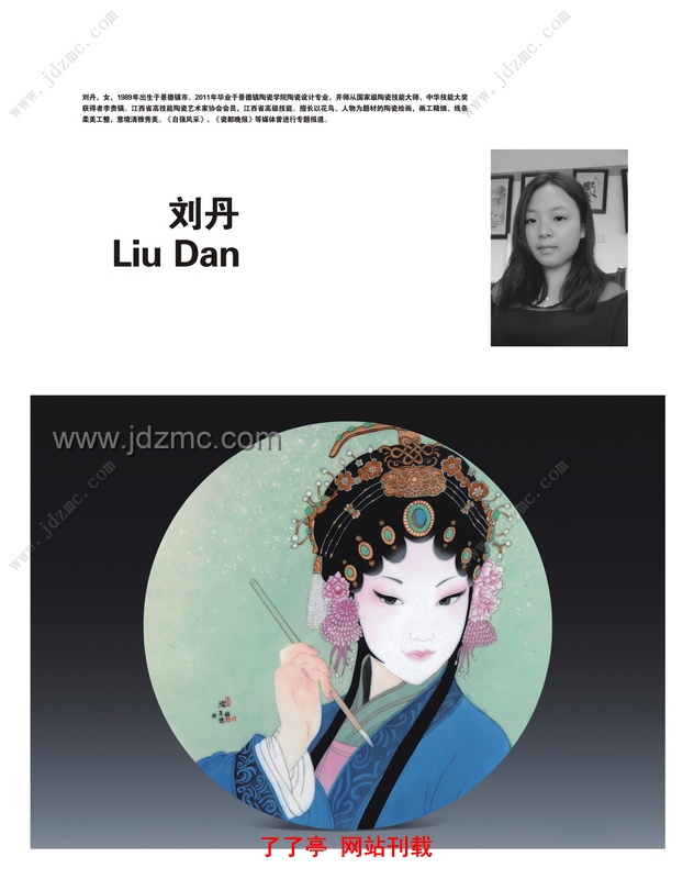刘丹,女,1989年出生于景德镇市。2011年毕业于景德镇陶瓷学院陶瓷设计专业,并师从国家级陶瓷技能大师、中华技能大奖获得者李贵镇。江西省高技能陶瓷艺术家协会会员,江西省高级技能。擅长以花鸟、人物为题材的陶瓷绘画,画工精细、线条柔美工整,意境清雅秀美。《自强风采》、《瓷都晚报》等媒体曾进行专题报道。