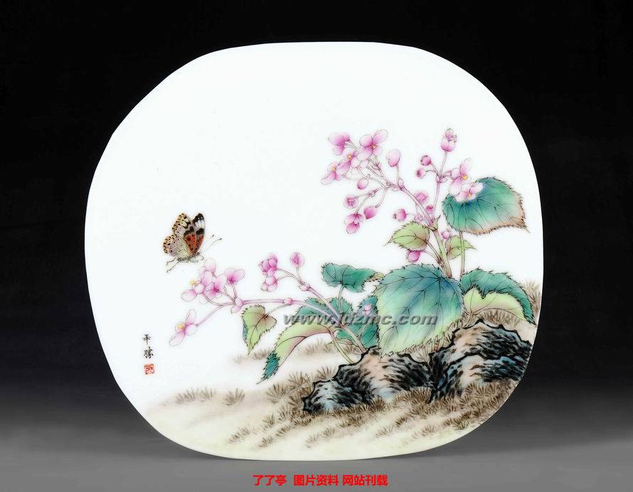 毕胜,粉彩花卉草虫瓷板-尺寸30+26cm