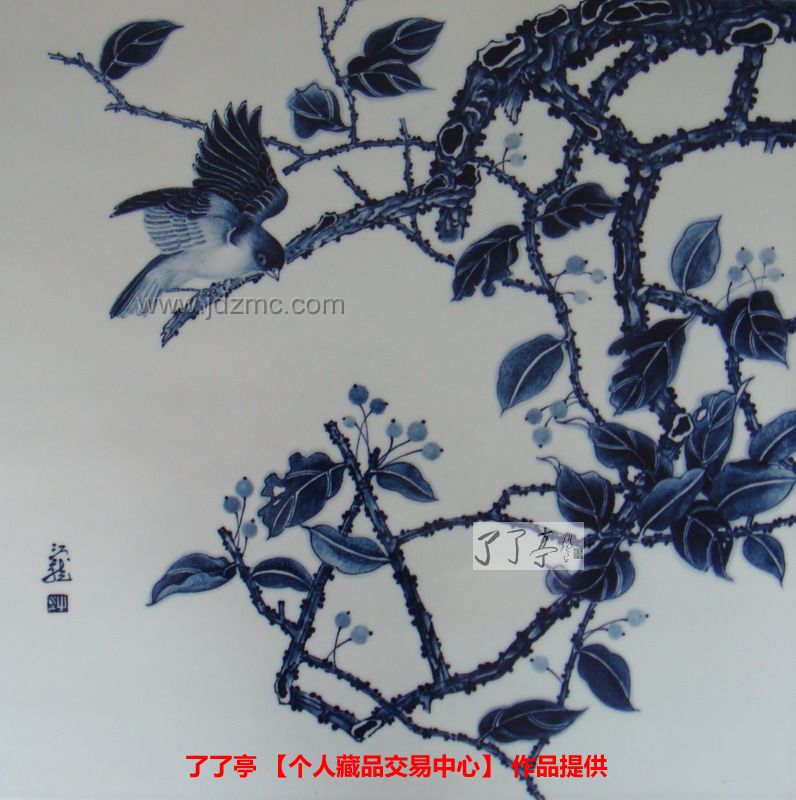 创作艺术家:江龙 景德镇市高级陶瓷美术师  作品的名称:青花《花鸟系列》 作品的大小:纯内径57*57cm瓷板 配备的鉴定资料:作品证书 作者合影 是否有残次瑕疵:无瑕疵 作品所在地:已送至 景德镇了了亭