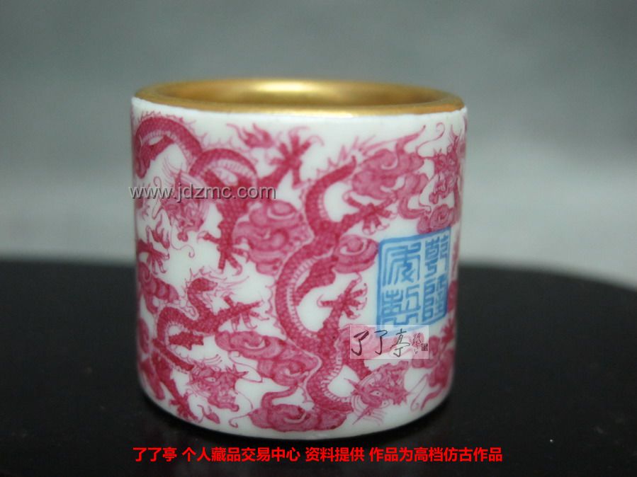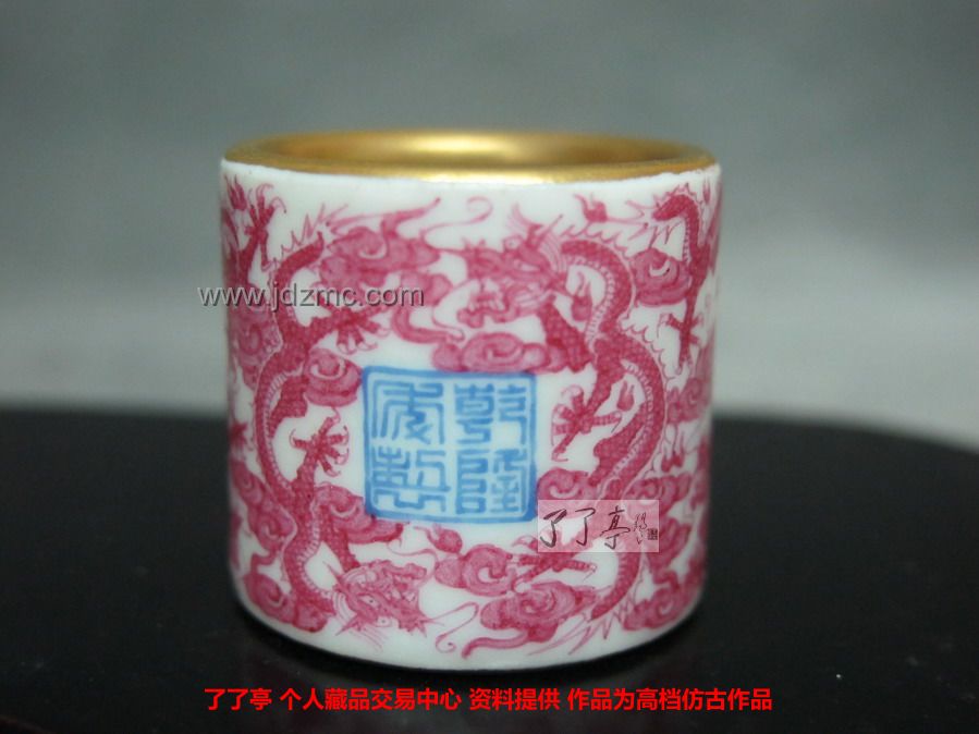 陶瓷扳指尺寸为:高:2.5cm 直径:2.5cm 周圈:9cm 宝石红九龙扳指,乾隆年制款识的瓷扳指九条神态各异的五爪龙里面包有金粉做工精细