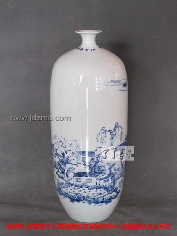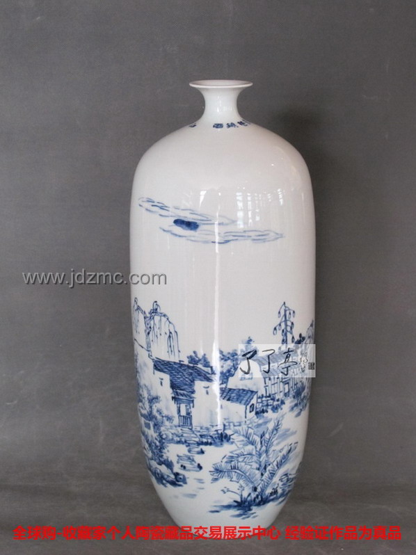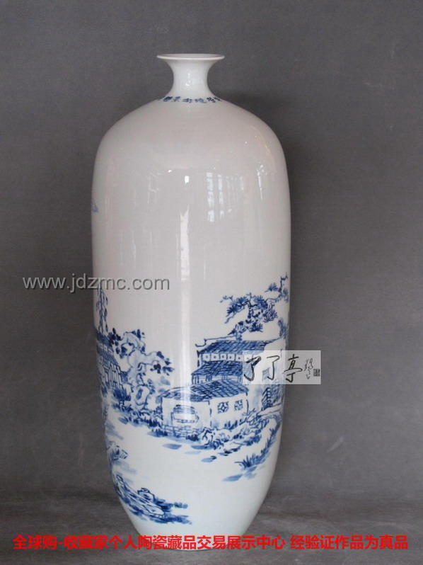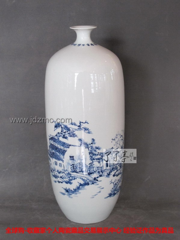 创作艺术家:方学晓 国家一级美术师 作品的名称:《江南》青花瓶 作品的大小:200件 高:49.5 宽度18.5cm 配备的鉴定资料:作品证书 是否有残次瑕疵:无瑕疵 作品所在地:景德镇