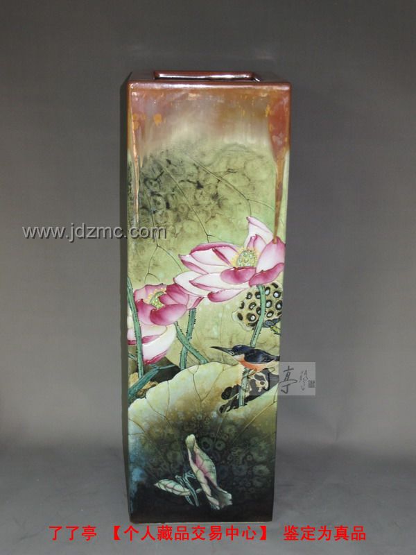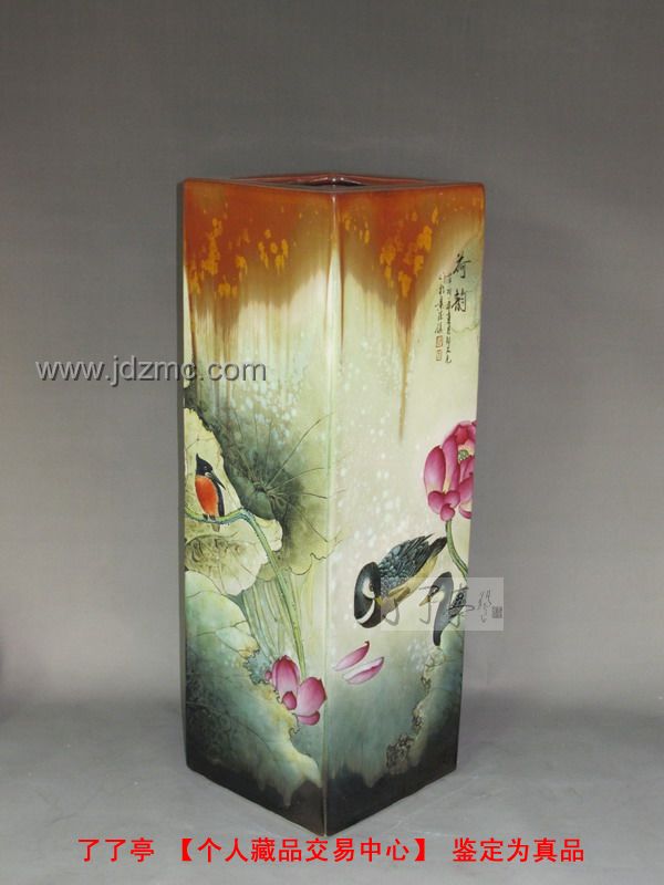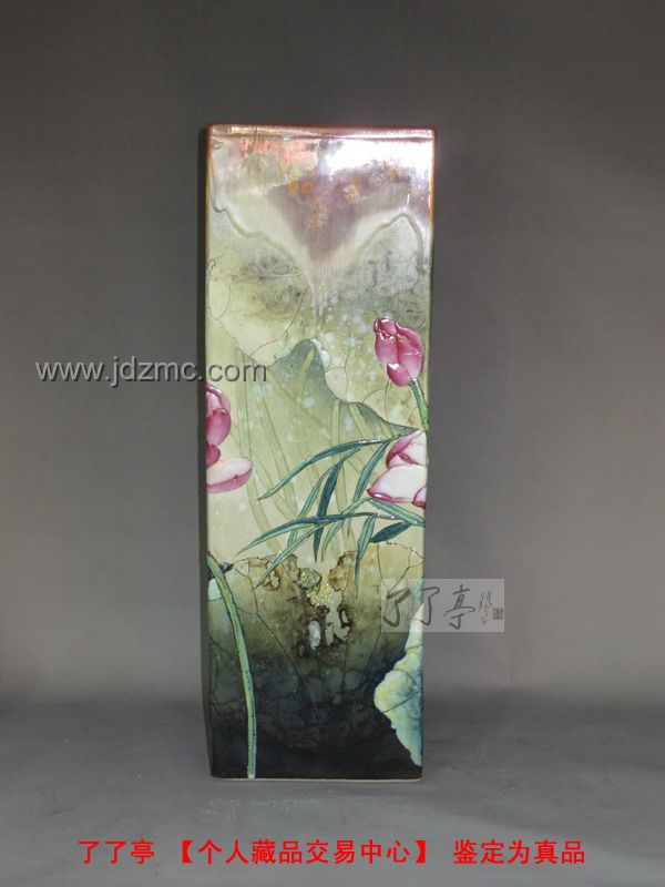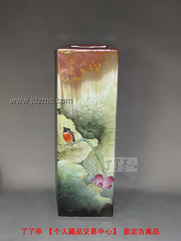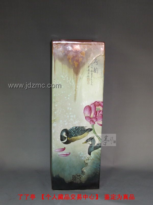 艺术家:邹文光 景德镇市高级陶瓷美术师 作品的名称:高温颜色釉综合装饰《荷韵》镶器 作品的大小:高55公分,宽度:18公分 配备的鉴定资料:作品证书 作者合影 是否有残次瑕疵:无瑕疵 作品所在地:已送至 景德镇了了亭