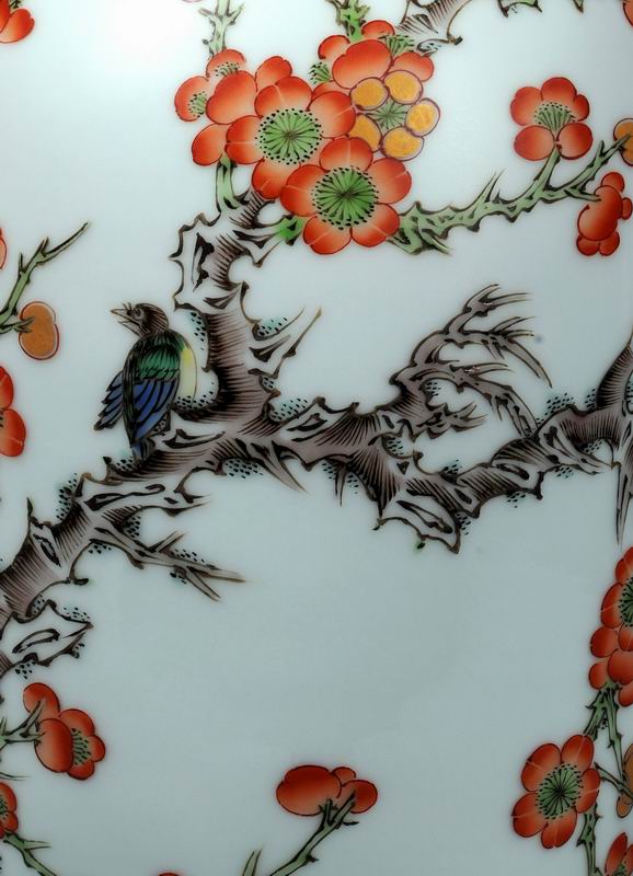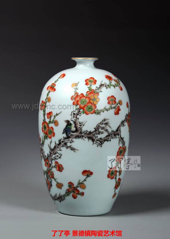 展示作品:创作艺术家:蓝国华,中国陶瓷艺术大师 作品的名称:《梅花瓶》青瓷古彩 大小:高35cm 肚径:20cm 口径:26cm 底直径:12cm 配备的鉴定资料:作品证书 作者合影 是否有残次瑕疵:无瑕疵 作品所在地:景德镇