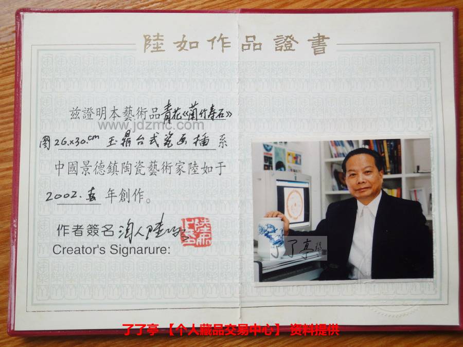 陆如 《兰竹寿石》青花 规格大小:150件 鉴定资料:作品证书 是否有残次瑕疵:无瑕疵 作品所在地: 省外 如需购买或委托咨询,索取全景大图请联系,栏目资源联系人:李申盛 电话:15079899527 email:33605414@qq.com QQ:33605414 备用Email:jdzmc@vip.163.com 委托须知:http://www.jdzmc.com/Article/Class9/wen/2011/06/07/19658.html