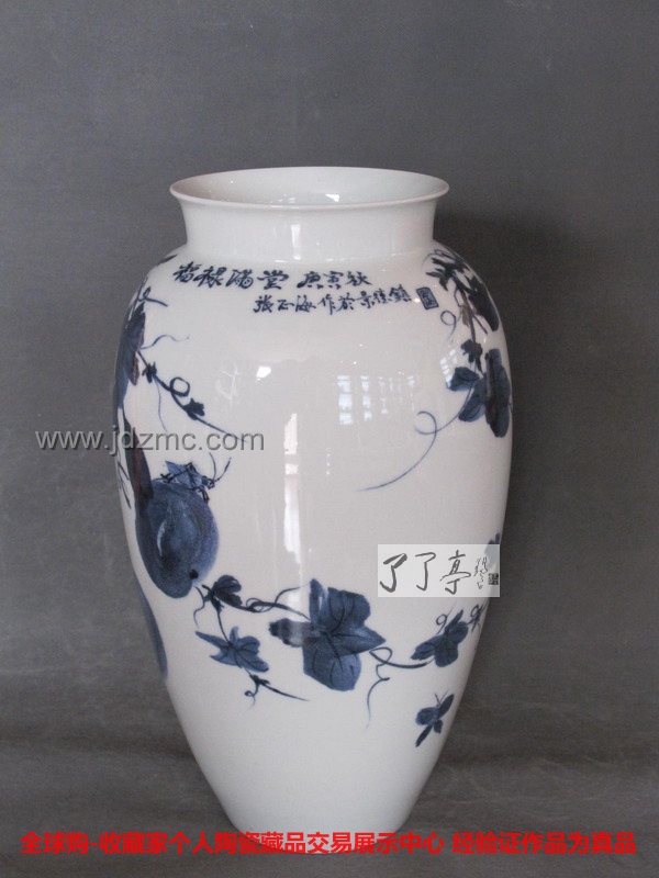 创作艺术家:张正海 中国陶瓷艺术大师 作品的名称: 青花《福禄满堂》瓷瓶 作品的大小:150件 开口17cm 高43cm 宽24.5cm配备的鉴定资料:作品证书 是否有残次瑕疵:无瑕疵 作品所在地:景德镇