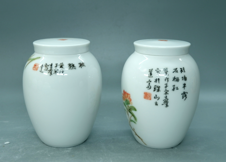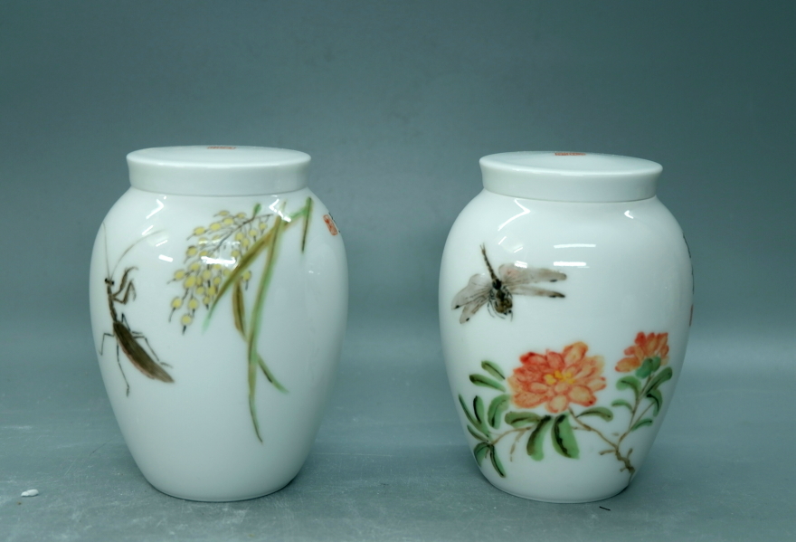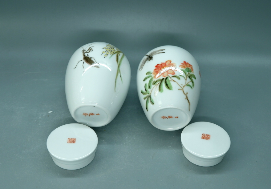 宋士群的姐姐告诉我:别看器件小,宋士群对小件和大件一样,每一个都很认真,从腹稿到落笔,从初稿到上彩,直至成瓷,每一个都要烧三遍。宋士群别出心裁地把粉彩与法瑯彩的工艺和手法融合在一起,丰富了色彩,园润了画面,生动了草叶,鲜活了虫蝶。工艺上步步周到细致,而且每一道工序都是由他亲手执行,绝不借手他人。