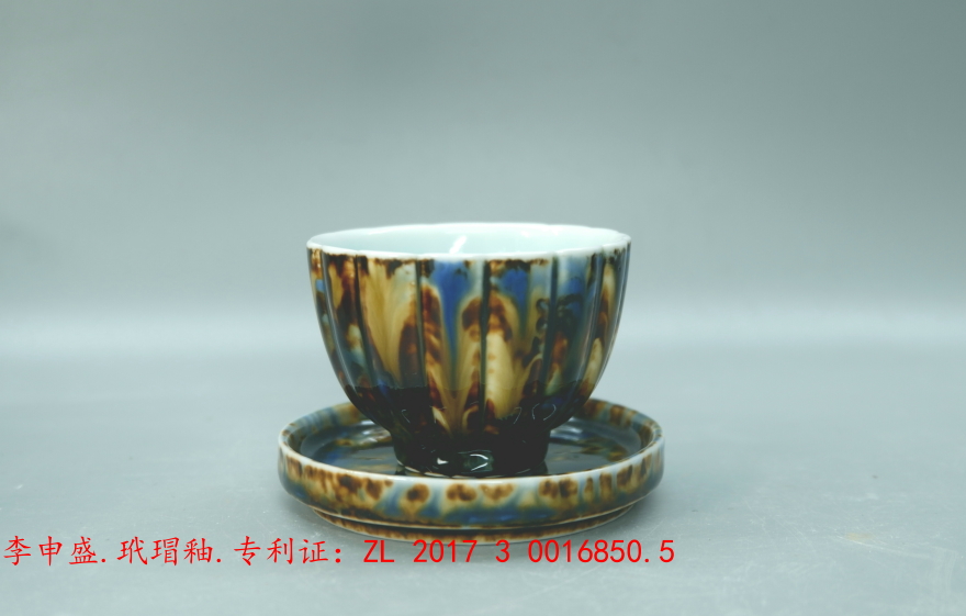 李申盛的创作思维是很开放的,十几年来他目睹景德镇无数艺术精品,深受陶瓷艺术的熏陶。他深深地恋上了陶瓷,恋上了高温颜色釉。10多年来,亲手做了许多茶杯。他了解高温颜色釉料性,摸熟了多种釉料复合的可能与条件,工艺和技术。他和夫人米承燕都是地质大学毕业,思维多元且关联自然,更难得的是多年来有幸经常得到王锡良、周国桢、戴荣华、李林洪、吳锦华等艺术家长辈的教导提点,提高了他的陶瓷艺术底蕴。